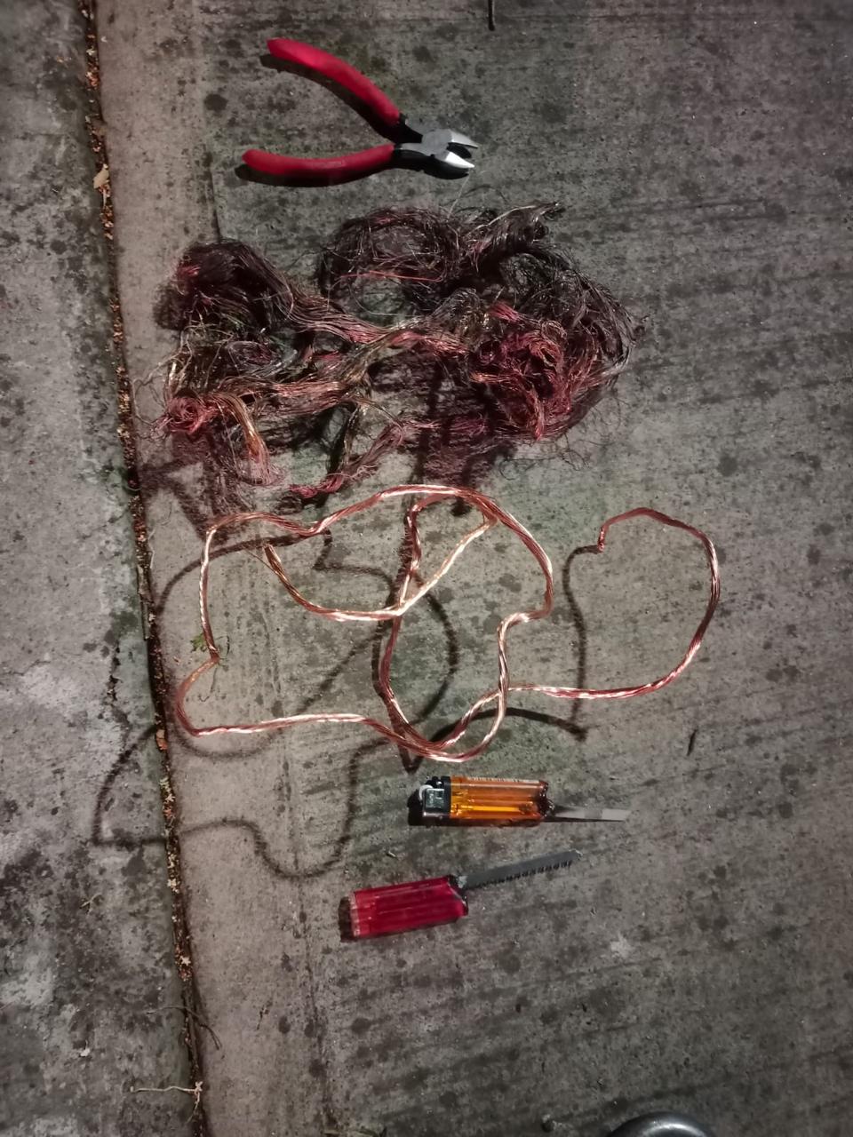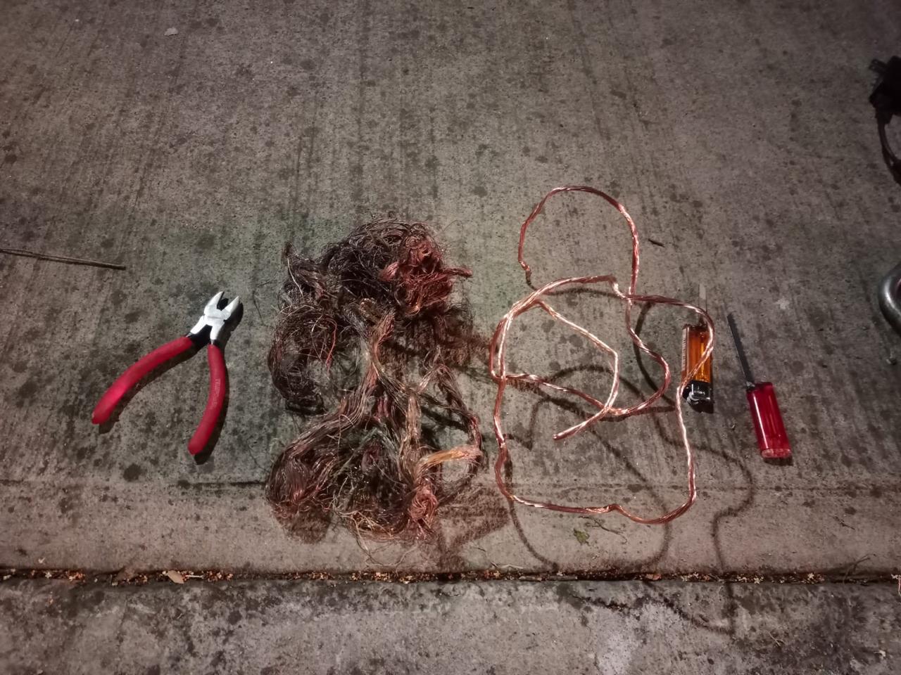 Enseguida los oficiales auxiliares se dirigieron al lugar, quienes observaron a un individuo que al notar la presencia policíaca se puso nervioso e intentó huir, sin embargo los efectivos impidieron esta acción y al realizarle una revisión preventiva le encontraron 5 metros aproximadamente de cable de cobre, dos navajas caseras y unas pinzas metálicas.