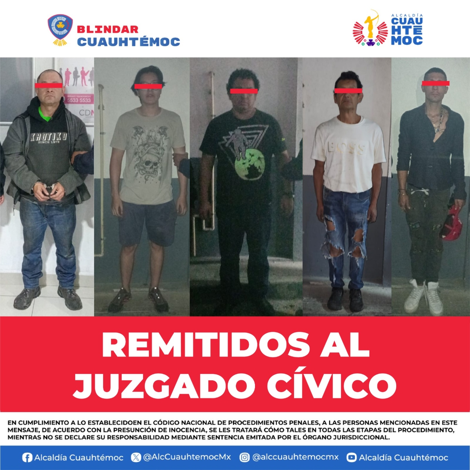 La detención se dio en la esquina que conforman las calles Gorostiza y Jesús Carranza y fue posible con el apoyo de las cámaras de videovigilancia del centro de monitoreo Base Diana, de la Dirección General de Seguridad Ciudadana y Protección Civil de Cuauhtémoc. Después de informarles el motivo de su detención y leerles su cartilla de derechos, los oficiales trasladaron a los detenidos a la Agencia del Juzgado Cívico CUH-1, donde se determinaría su situación jurídica.