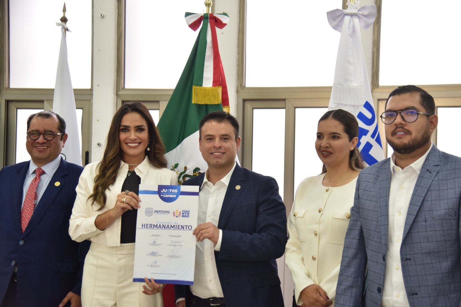 La alcaldesa Alessandra Rojo de la Vega y el presidente municipal de Zacatecas, Miguel Ángel Varela Pinedo, firmaron el Pacto de Hermanamiento entre la Alcaldía Cuauhtémoc y el municipio de Zacatecas, con el objetivo de fortalecer la defensa de los derechos humanos, consolidar una agenda contra la violencia de género y promover el desarrollo cultural y turístico en ambas demarcaciones.