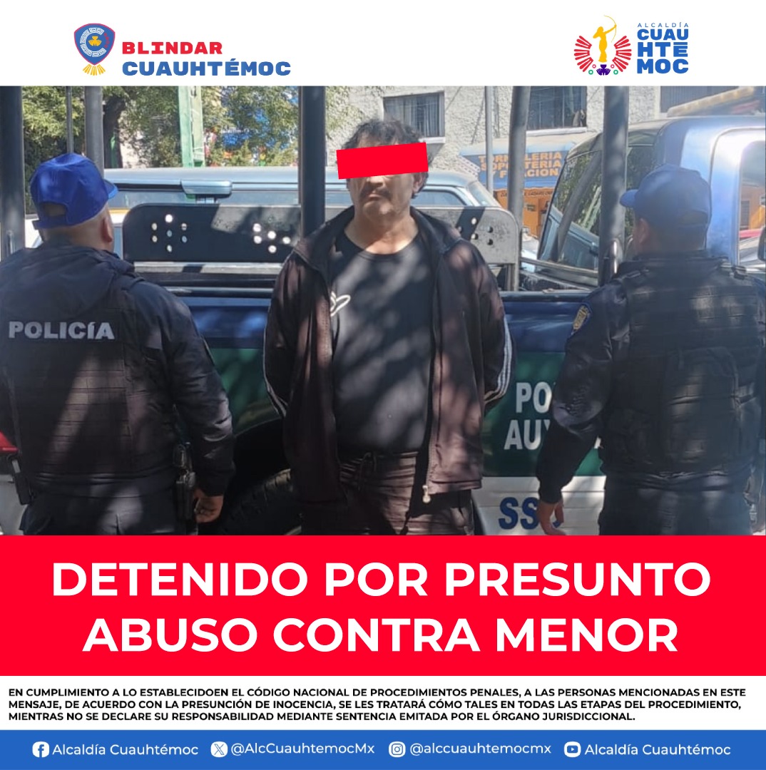 Elementos de la Policía Auxiliar (PA) de la Alcaldía Cuauhtémoc detuvieron a un hombre señalado por realizar tocamientos indebidos a una menor de edad en la colonia Obrera. La detención se llevó a cabo tras una denuncia ciudadana en Eje Central Lázaro Cárdenas y Juan A. Mateos.