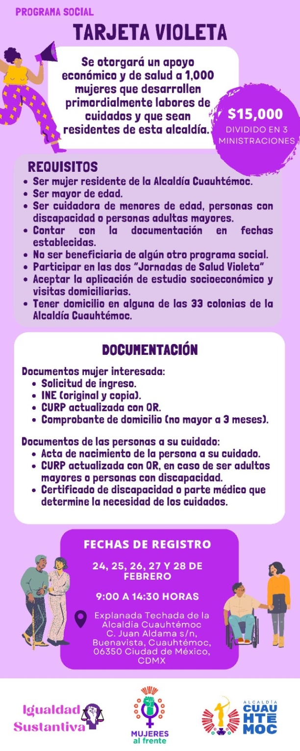 El Gobierno de la Alcaldía Cuauhtémoc publicó la convocatoria del programa social Tarjeta Violeta, dirigido a mujeres mayores de edad que se encargan del cuidado de niñas, niños, personas con discapacidad o adultos mayores y que no cuentan con autonomía económica.