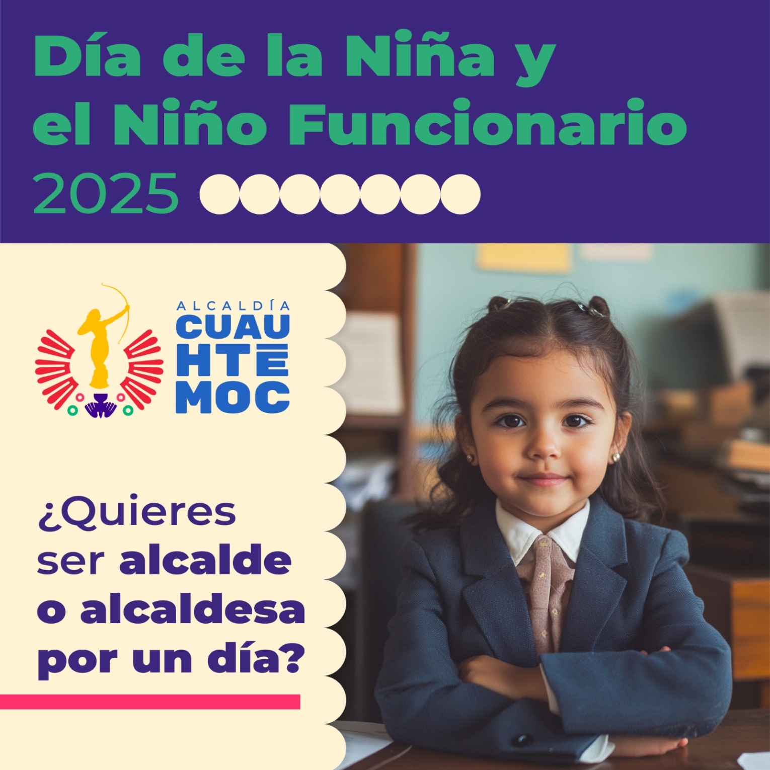 El Gobierno que encabeza Alessandra Rojo de la Vega en la Alcaldía Cuauhtémoc emitió una convocatoria para que niñas y niños entre 8 y 13 años puedan participar en el Día de la Niña y el Niño Funcionario 2025, una iniciativa que busca fomentar la participación infantil en temas de gobierno y desarrollo social. Los menores cuyos trabajos resulten seleccionados, ocuparán cargos simbólicos dentro de la Alcaldía, incluyendo el de Niño Alcalde o Niña Alcaldesa, Concejales y Directores Generales.
