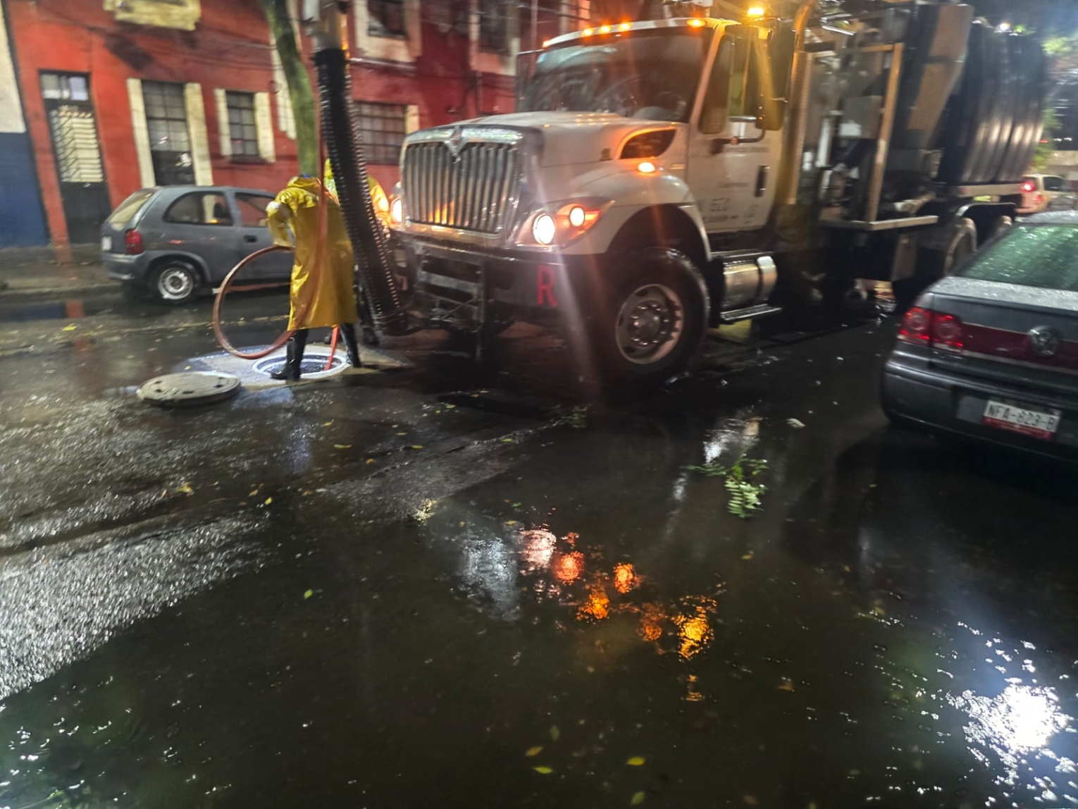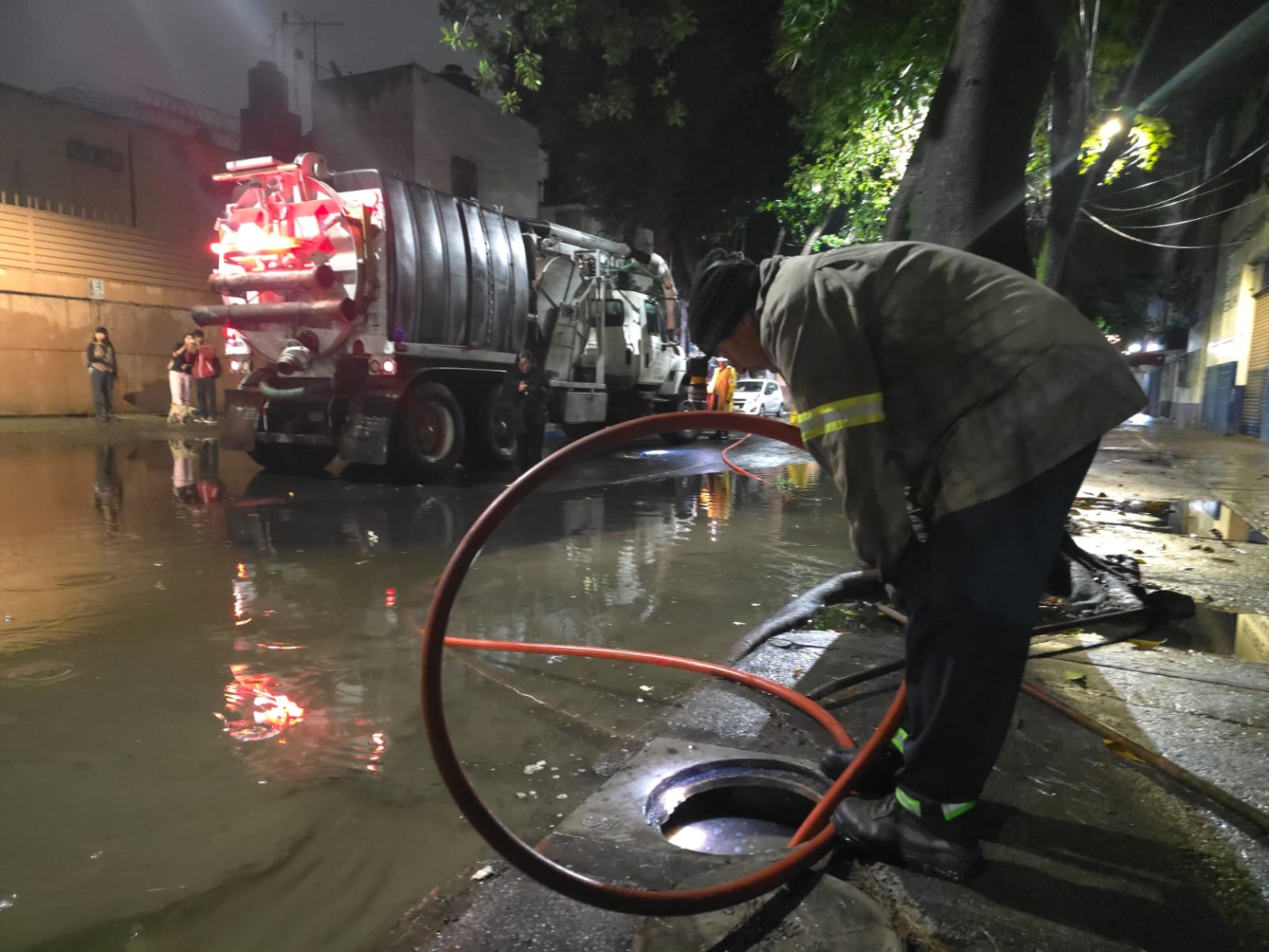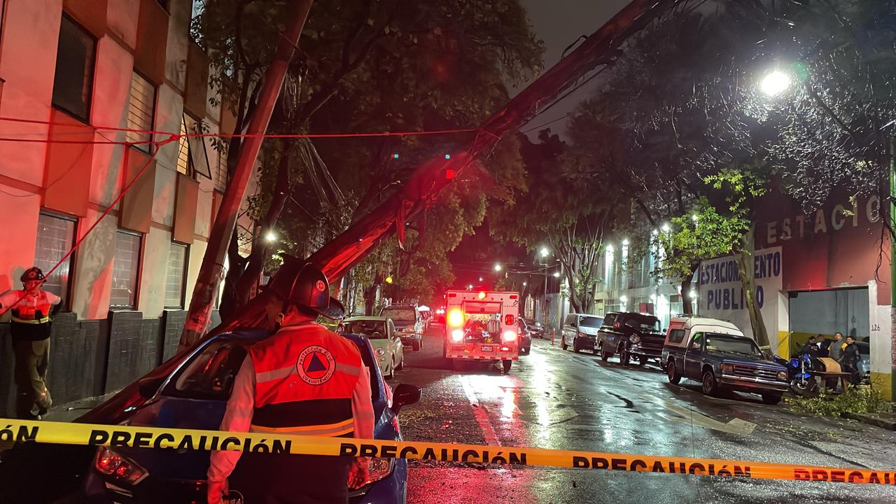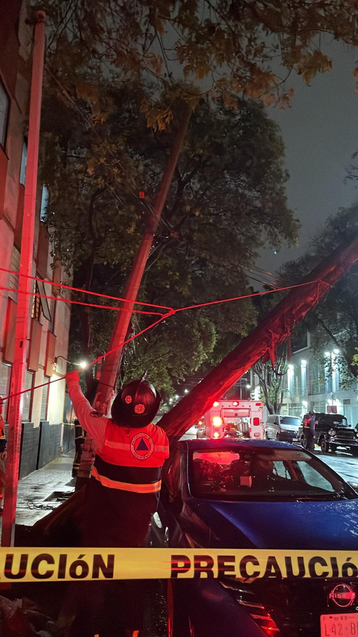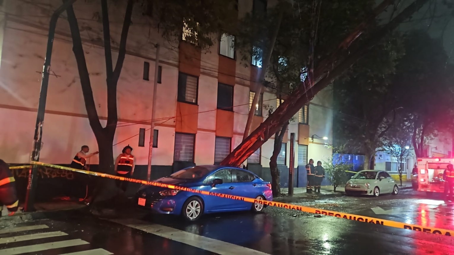 En la colonia Doctores, se realizan trabajos de desazolve para acelerar el flujo del agua en calles anegadas. En la colonia San Rafael, brigadas de Protección Civil atienden reportes de caída de árboles y ramas.