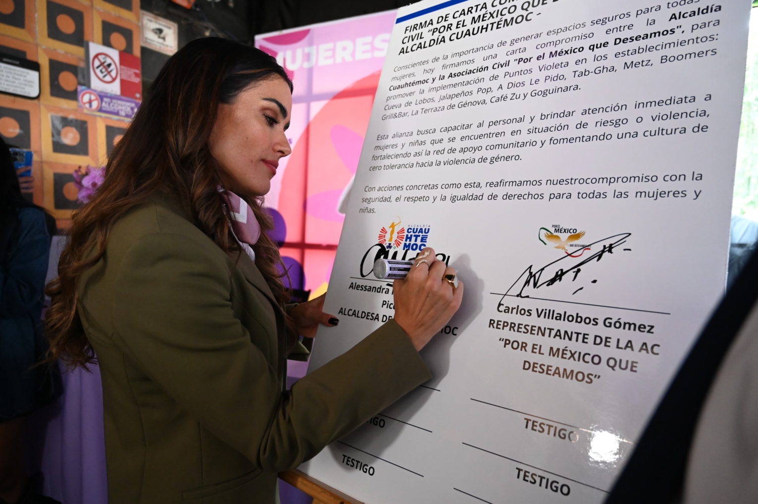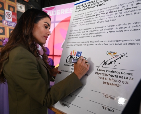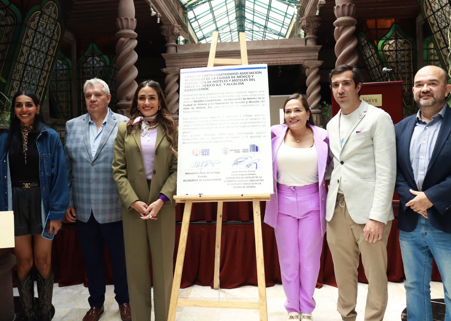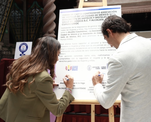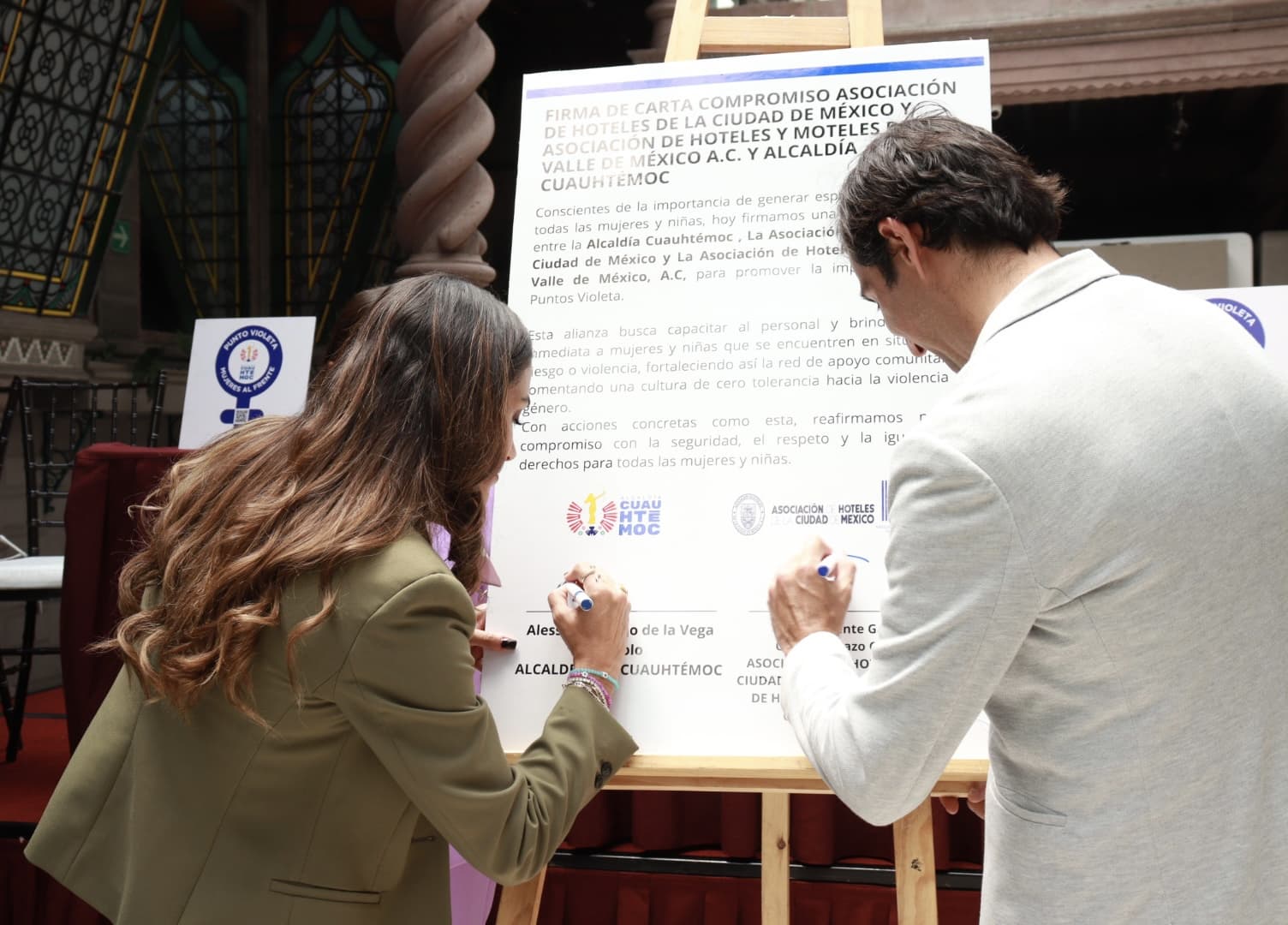 La alcaldesa de Cuauhtémoc, Alessandra Rojo de la Vega firmó dos nuevas cartas compromiso con agrupaciones del sector hotelero y restaurantero, a través de las cuales se instalarán nuevos Puntos Violeta en la demarcación como parte de la estrategia Reacción Violeta. En esta jornada, se sumaron 11 restaurantes de la Zona Rosa —colonia Juárez— y se proyecta instalar al menos 20 puntos más en hoteles de la alcaldía durante una primera etapa.