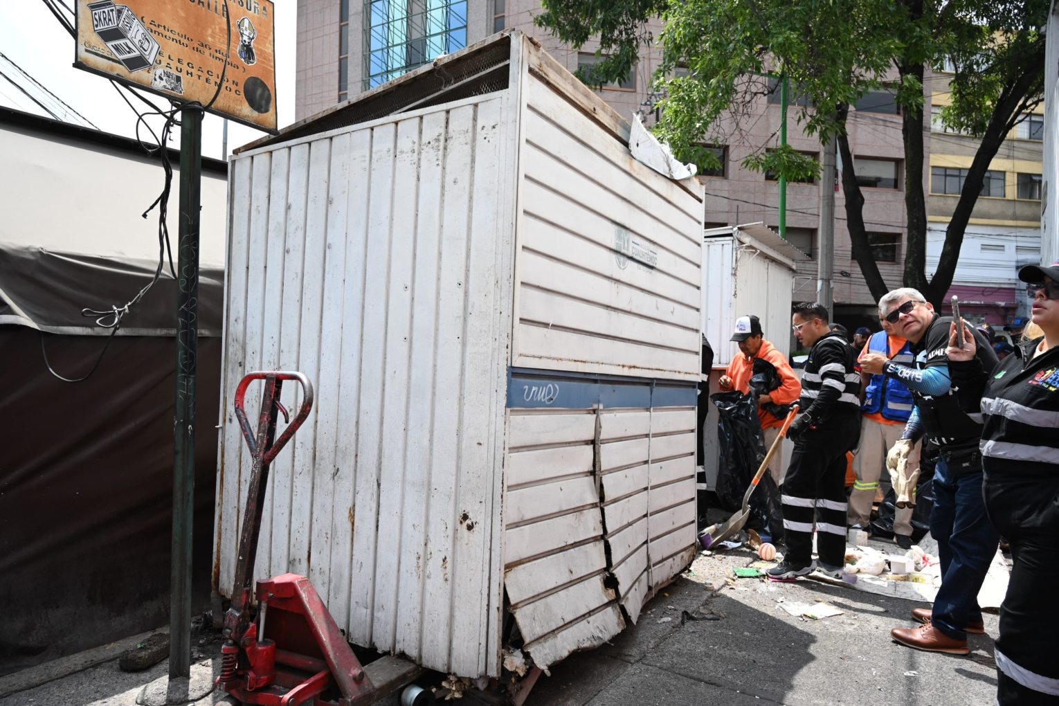 El primer punto intervenido fue la intersección de Isabel la Católica y Antonio Solís, donde el personal operativo retiró un puesto metálico que almacenaba una considerable cantidad de basura, así como fauna nociva en su interior y que había sido reportado por vecinas y vecinos de la zona, argumentando que se había convertido en un foco de insalubridad e inseguridad para quienes habitan y transitan.