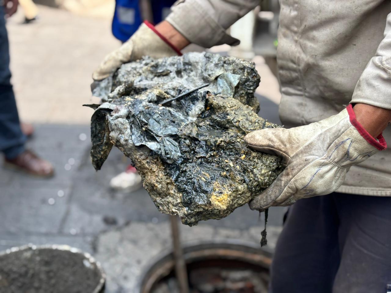 Como parte de las acciones preventivas para evitar inundaciones, encharcamientos y mejorar el espacio público, instruidas por la alcaldesa Alessandra Rojo de la Vega, trabajadores de la Alcaldía Cuauhtémoc realizaron trabajos de desazolve en tres coladeras de la calle República de Uruguay, colonia Centro; como resultado, se expulsaron cerca de 20 cuerpos semejantes a una roca, formados por la acumulación de grasa solidificada.