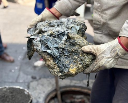 Esta intervención se centró en la expulsión de masas formadas debido a la acumulación de grasa en el drenaje, lo cual es una de las principales causas de los problemas de encharcamiento.