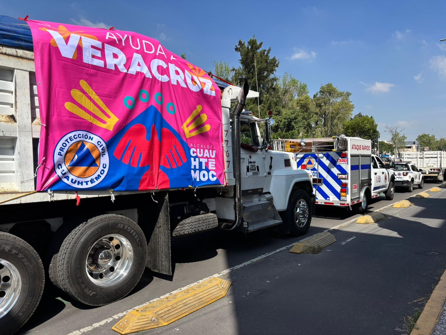 Desde la explanada de la Alcaldía Cuauhtémoc partió una caravana conformada por 36 personas, toneladas de ayuda humanitaria y más de 10 unidades operativas rumbo al estado de Veracruz, en apoyo a las comunidades afectadas por las recientes lluvias.
