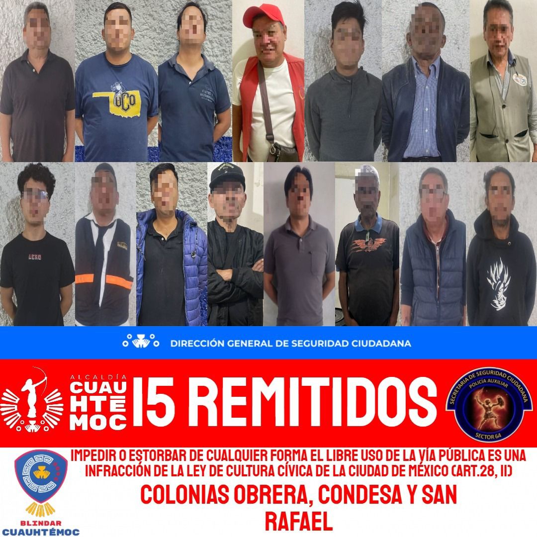 En diferentes acciones efectuadas en calles de las colonias Obrera, Condesa y San Rafael, policías auxiliares de Blindar Cuauhtémoc lograron la remisión al Juzgado Cívico de 15 personas por impedir o estorbar el libre uso de la vía pública, al exigir a los automovilistas un pago por dejar sus vehículos estacionados en ellas.
