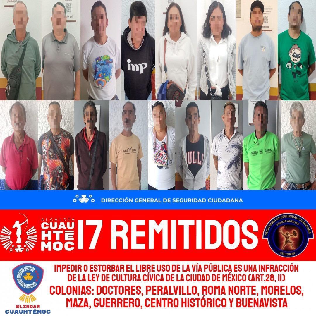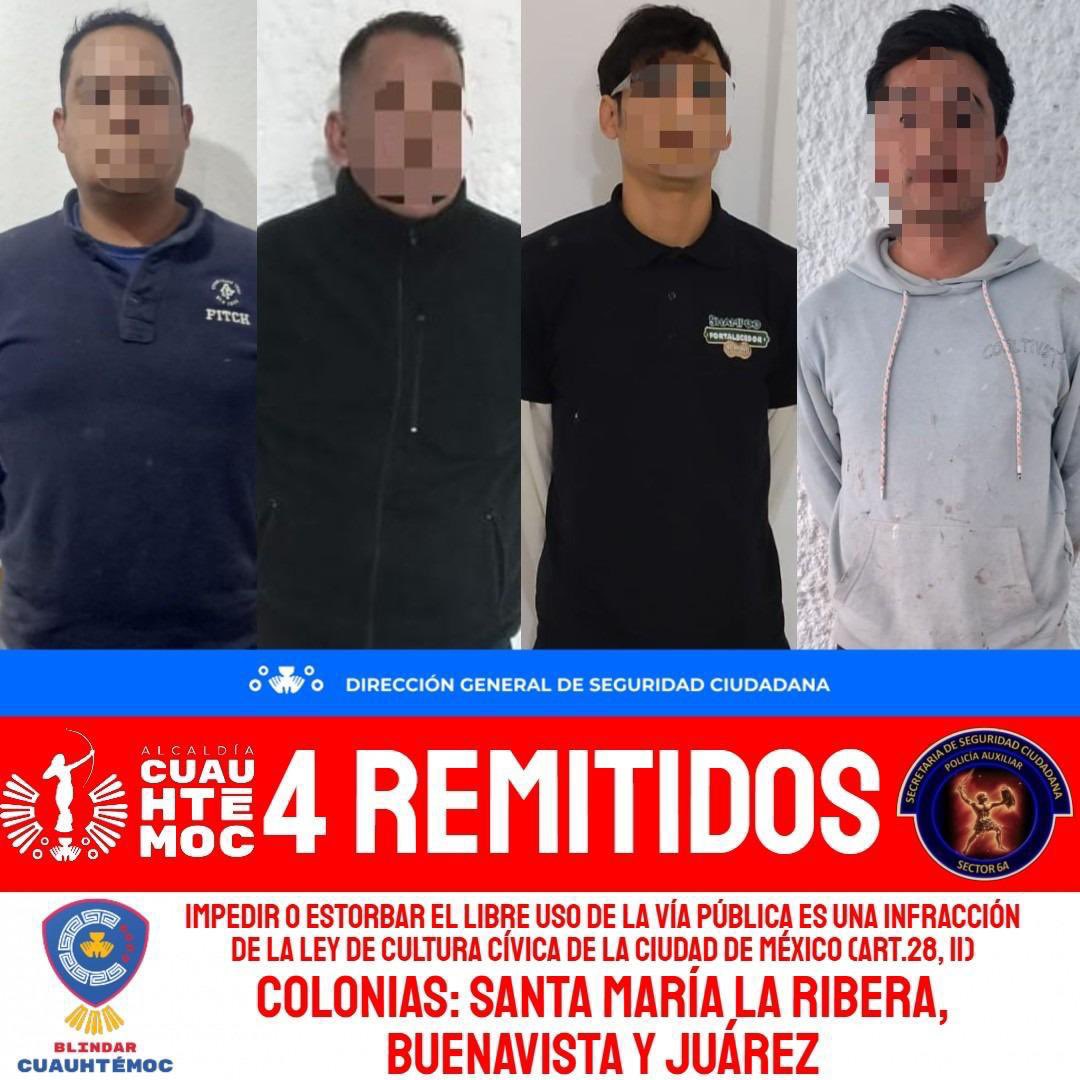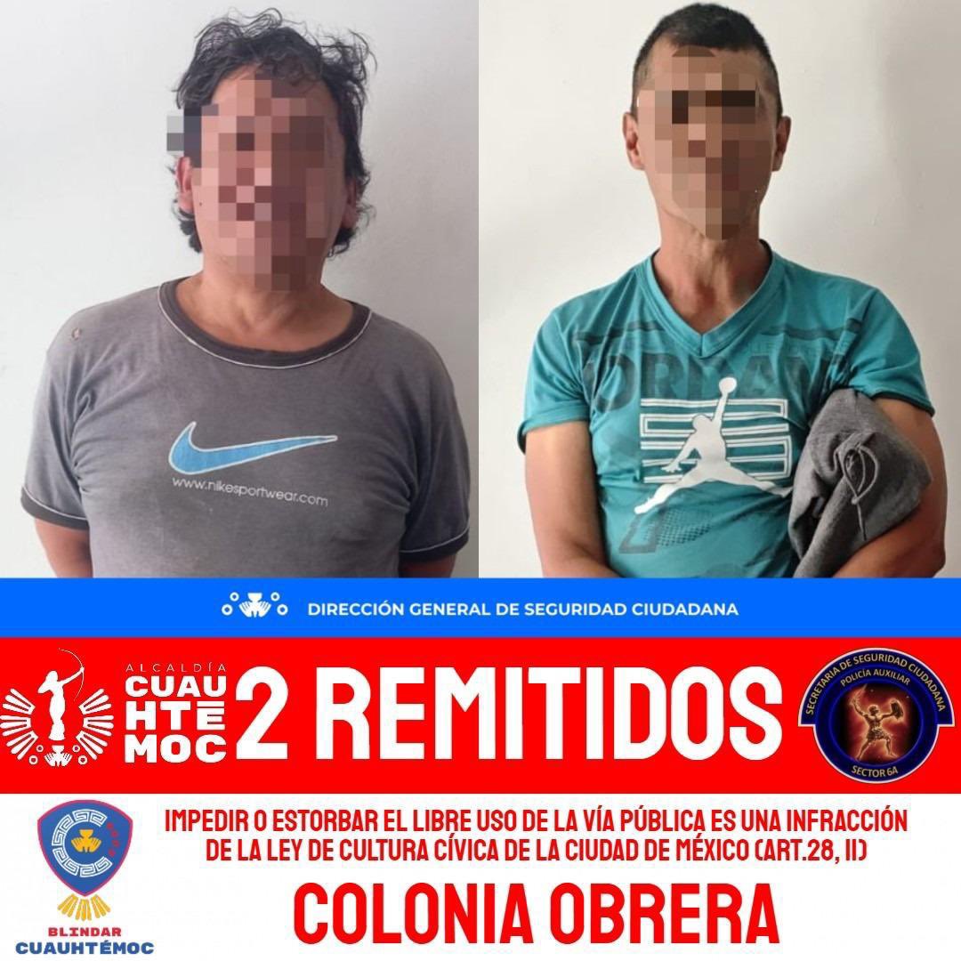 Las remisiones se realizaron por infringir el Artículo 28, apartado II, de la Ley de Cultura Cívica de la Ciudad de México, que establece como falta administrativa el impedir u obstaculizar, sin causa justificada ni autorización, el libre uso del espacio público y el tránsito de las personas.