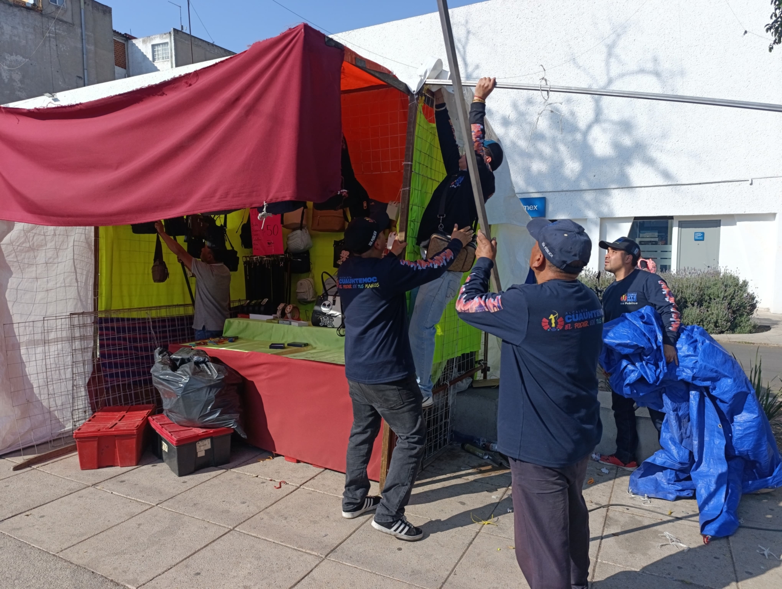 Al arribar al sitio, personal de Vía Pública de la demarcación dialogó con los comerciantes para solicitar el retiro de los puestos semifijos, quienes previamente ya habían sido notificados. Fueron los mismos trabajadores de la dependencia quienes auxiliaron a los vendedores para guardar y retirar por sus propios medios la mercancía; únicamente en el caso de puestos que se encontraban sin la presencia de un responsable, los enseres fueron trasladados a bodegas de la alcaldía, donde sus propietarios podrán reclamarlos acreditando su propiedad.