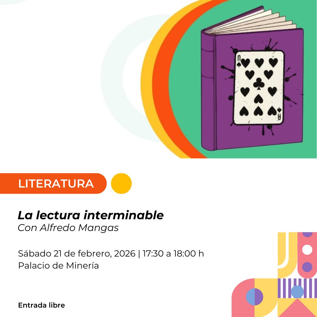 En materia literaria, este sábado 21 de febrero a las 17:30 horas se realizará La lectura interminable, con Alfredo Mangas, como parte de las actividades de la 47ª edición de la Feria Internacional del Libro del Palacio de Minería. La sesión continuará el domingo 22 a las 12:00 horas en la Casa de Cultura Alfonso Reyes. Se trata de un libro-club en el que se presentarán dos de los doce Cuentos peregrinos de Gabriel García Márquez.