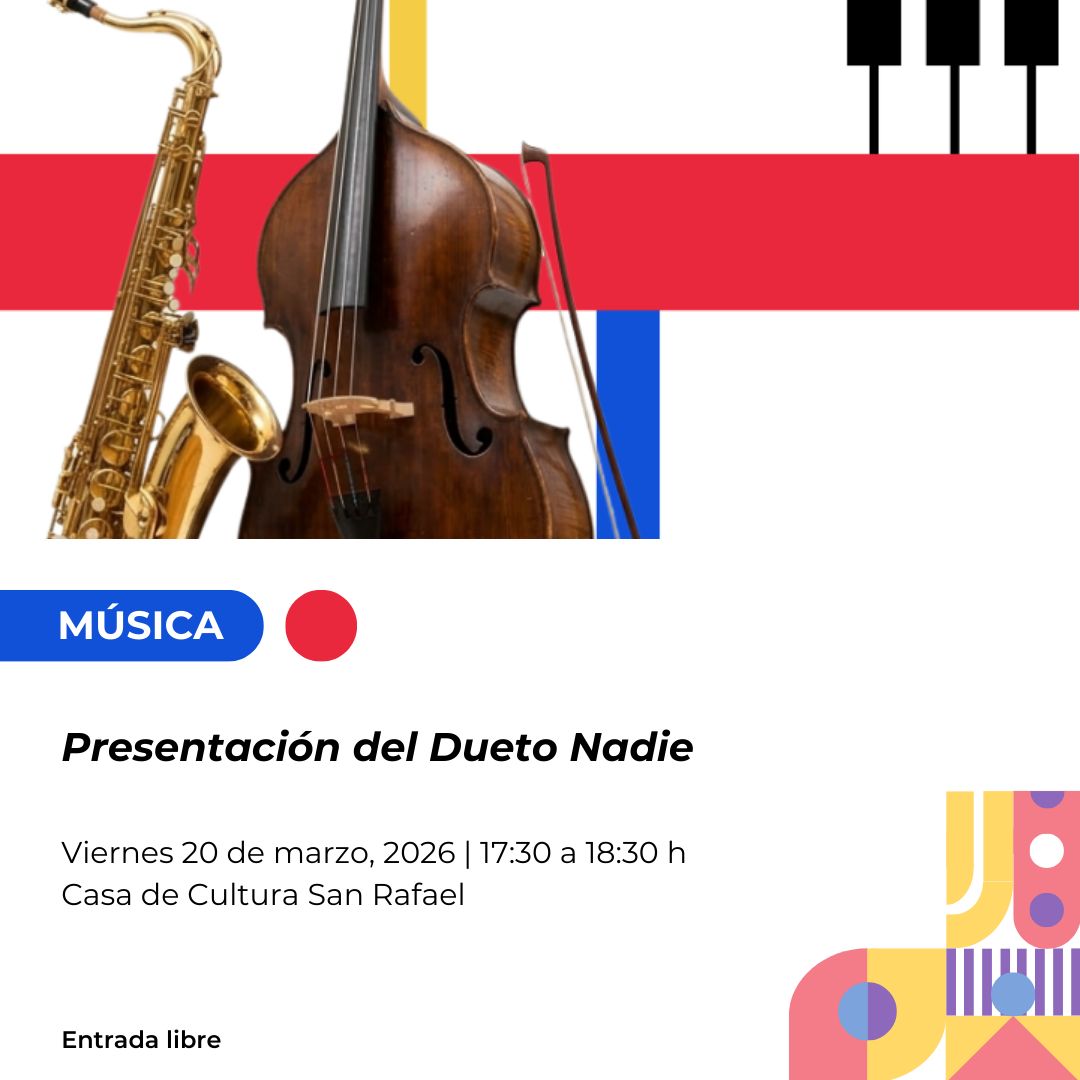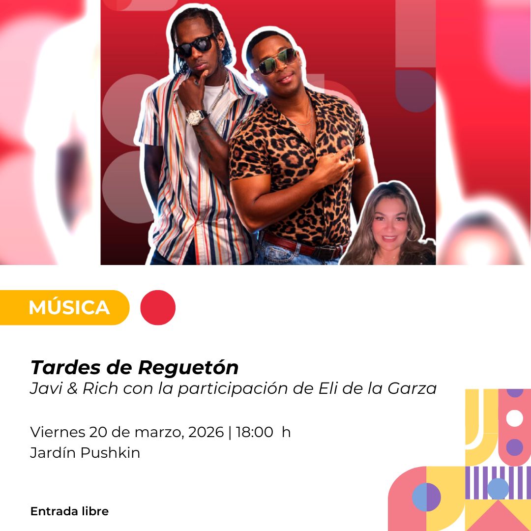 El viernes 20 de marzo, a las 17:30 horas, se presentará el Dueto Nadie en la Casa de Cultura San Rafael. Ese mismo día, a las 18:00 horas, se realizará Tardes de Reguetón en el Jardín Pushkin, con la participación de Javi & Rich y Eli de la Garza.