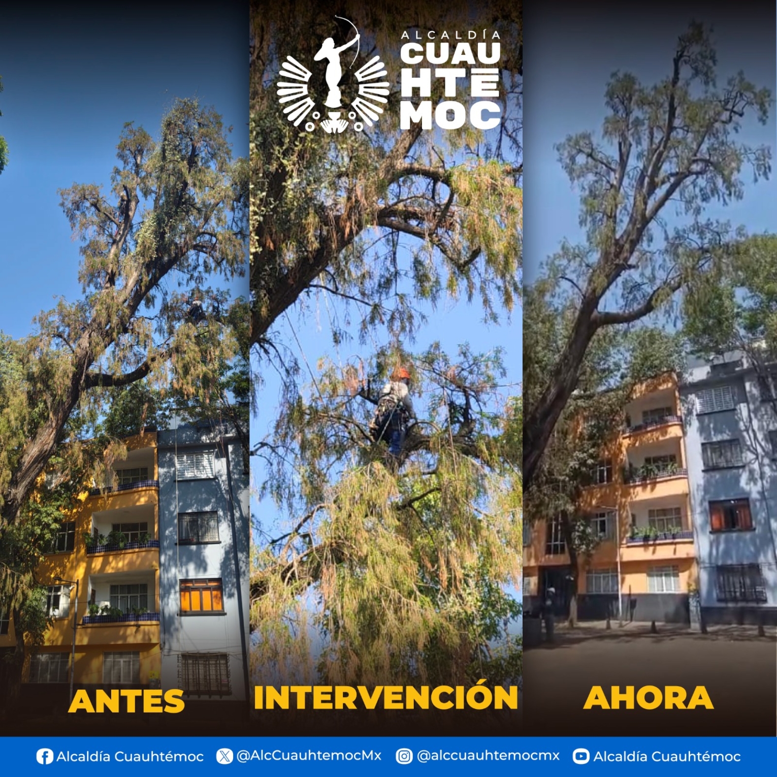 La Dirección General de Servicios Urbanos de la Alcaldía Cuauhtémoc, bajo instrucciones de la alcaldesa Alessandra Rojo de la Vega, realizó una intervención fitosanitaria en el ahuehuete histórico ubicado en el Jardín Tabacalera, con el objetivo de atender una infestación moderada de muérdago.